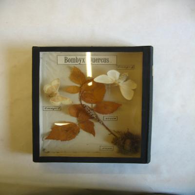 Caja-expositor sobre el proceso metamórfico de Bombyx quercus. Se pueden observar: