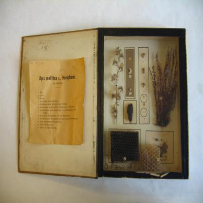 En una caja-expositor en forma de libro, con una tapa, y la parte superior de cristal. Posee una etiqueta pegada en la parte posterior de la tapa, con inscripción a máquina: "Apis mellifica L., Honigbiene. (12 objekte)" y la descripción de estos 12 objetos en lo que parece alemán. Tanto en la tapa como en un lateral de la caja está seregrafiado "Apis mellifiea". Escrito a lápiz en la contraportada "XII 296" y en la esquina izquierda de la etiqueta "XIII4875a".