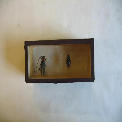 Artrópodo. Hexápodo. Subclase Pterigotos. O. Coleoptera. Fam. Cerambicydae y Carabidae Cajita con dos ejemplares de coleópteros en alfileres. Cerambícido (Aromia moschata): Ejemplar alargado, de lados paralelos, con élitros verdosos con irisaciones, tórax anaranjado y cabeza verdosa. Los élitros están abiertos y permiten ver unas alas membranosas translúcidas. Las antenas están formadas por varios septos, y son muy largas, más que la longitud del cuerpo. Carábido: Ejemplar de color negro-parduzco, con puntitos azulados por el abdomen. Abdomen ovalado, acabado en punta, cabeza alargada, con dos fuertes mandíbulas. Presencia de anténulas. Antenas implantadas a los lados de la cabeza.