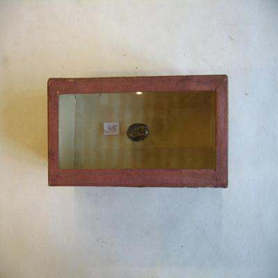 En una cajita, con la parte superior de la tapa de cristal. Etiqueta interior bajo el ejemplar , con inscripción a máquina "Málaga 23-IV-1905" y otra clavada en otro alfiler, a bolígrafo "45".