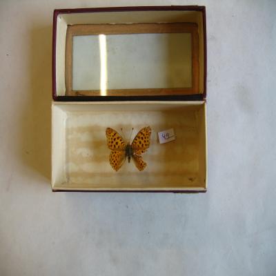 Artrópodo. Hexápodo. Subclase Pterigotos. O. Lepidoptera. Fam. Nymphalidae Una mariposa en un alfiler. Alas anchas, coloración amarillo-anaranjada, con manchas pardas. Tiene el ala posterior derecha rota. Cuerpo peludo, abdomen no completo, antenas acabadas en una especie de maza.