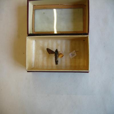Artrópodo. Hexápodo. Subclase Pterigotos. O. Lepidoptera. Fam. Sphingidae Mariposa en un alfiler. Cuerpo ancho, peludo, con abdomen segmentado transversalmente. No conserva las antenas. Conserva el ala anterior izquierda y el ala posterior derecha. La anterior es más larga, oscura, mientras que la posterior es mas corta, ancha y amarillenta.
