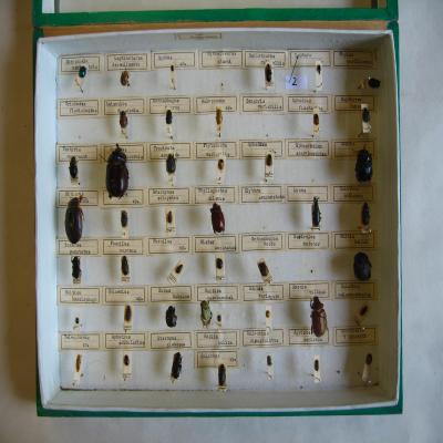 Artrópodo. Hexápodo. Subclase Pterigotos. O. Coleoptera. Caja-expositor con 50 especies de escarabajos, pero falta alguno. Los nombres de las especies están escritos en pequeñas etiquetas, y debajo el ejemplar (si lo hay) en un alfiler o en un cartoncito y este clavado con un alfiler. Las especies son las siguientes (sin ejemplar=s.e., con ejemplar =c.e.): Crysomela manthastris (c.e.), Leptinotarsa decemlineata (c.e.), Agabus sp. (c.e.), Gynnopleurus struni (s.e.), Heliotaurus ruficollis (c.e.), Leptura sp. (c.e.), Phylax castilianus (c.e.), Trichodes flavicinctus (s.e.), Anisoplia floricola (c.e.), Onthophagus taurus (c.e.), Malacosoma sp. (c.e.), Zonabris variabilis (s.e.), Aphodius fimetarius (c.e.), Oxythyrea funesta (c.e.), Tentyria mucronata (c.e.), Orictes nasicornis (c.e.), Tropinota squalida (c.e.), Phytodecta variabilis (c.e.), Aphodius sp. (c.e.), Sphaeridium scarabaeoides (s.e.), Copris lunaris (c.e.), Ditiscus pisanus (c.e.), Larinus sp. (c.e.), Brachynus sclopetra (c.e.), Phyllognatus silenus (c.e.), Clythra sexpunctata (s.e.), Lyxus sp. (c.e.), Calathus ambiguns (c.e.), Scaurus punctatus (c.e.), Poecilus cupreus (c.e.), Poecilus sp. (c.e.), Hister uncinatus (c.e.), Onthophagus vacca (c.e.), Geotrupes mutator (s.e.), Onitis belial (c.e.), Haltica ampelophaga (c.e.), Chlaenius sp. (c.e), Bubas bubalus (c.e.), Haltica carabanchel (c.e.), Adali variegata (c.e.), Anoxia villosa (c.e.), Calathus melanocephalus (c.e.), Telesphorus sp. (c.e.), Aphodius scibalarius (c.e.), Steropus globosus (c.e.), Hoplia aulica (c.e.), Malachius bioustulatus (c.e.), Agriotes sericeus (c.e.), Coccinella 7 punctata (c.e.), Calathus sp. (c.e.).