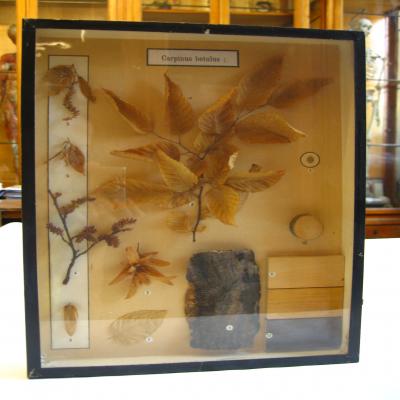 Angiospermas. Clase Magnoliopsida (Dicotiledóneas). Fam. Betulaceae Caja-expositor que muestra a Carpinus betulus y diferentes partes de forma numerada: Semilla, flores, frutos, rama, corteza, una hoja, sección transversal del tronco, y diferentes maderas trabajadas. En la rama las hojas se disponen de forma alterna. Color amarillento, con los nervios laterales alternos, borde serrado. Flores en amentos colgantes. Frutos formando como un ramillete. Es trilobulado, con el lóbulo central a modo de lengüeta, situándose la semilla en medio. Corteza bastante lisa, oscura. La madera bastante uniforme. Distintos tonos.