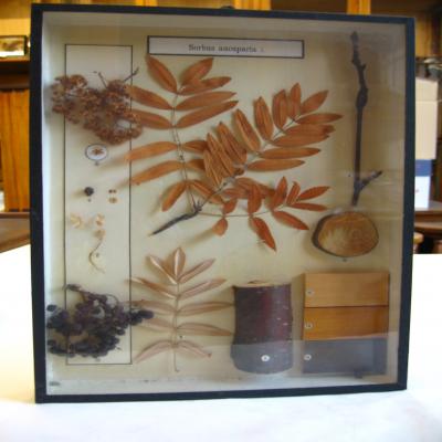 Caja-expositor que muestra a Sorbus aucuparia y diferentes partes de forma numerada: Frutos, ramita con raíces, semillas, flores, ramas, corteza, sección transversal del tronco, y diferentes maderas trabajadas.
