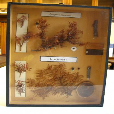 En una caja-expositor con la tapa de cristal. Las diferentes partes que se exponen están numeradas con pequeñas etiquetas redondas escritas a máquina, del 1 al 8 para el enebro, y del 1 al 7 para el tejo. Hay dos etiquetas, una por árbol, con inscripción a máquina: \Juniperus communis L\ y \Taxus baccata L.\.