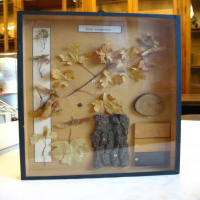 En una caja-expositor con la tapa de cristal. Las diferentes partes que se exponen están numeradas con pequeñas etiquetas redondas escritas a máquina, del 1 al 12. Hay una etiqueta en la parte superior con inscripción a máquina: \Acer campestre L.\.
