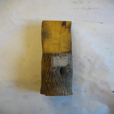 Hacia la mitad de la pieza, se ha cortado longitudinalmente y transversalmente, de modo que la mitad del tronco está completa, y la otra sólo conserva la mitad longitudinal. Este corte permite ver el interior de la madera.