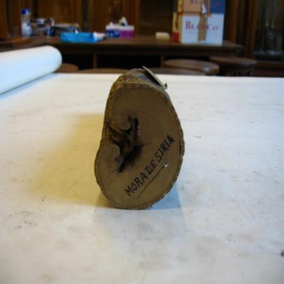 El tronco lleva unida con un pequeño clavo a la corteza una pequeña etiqueta, antigua, con inscripción a máquina y bolígrafo: \UNIVERSIDAD CENTRAL. Mora de Siria. Gabinete de Historia Nat.\. En el extremo completo tiene escrito con rotulado \MORA DE SIRIA\.
