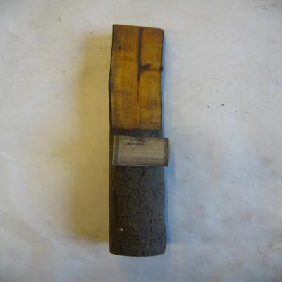 El tronco lleva unida con un pequeño clavo a la corteza una pequeña etiqueta, antigua, con inscripción a máquina y bolígrafo: \UNIVERSIDAD CENTRAL. Laurel. Gabinete de Historia Nat.\. En el extremo completo tiene escrito con rotulador \LAUREL\.