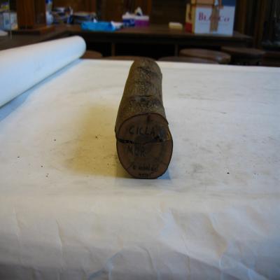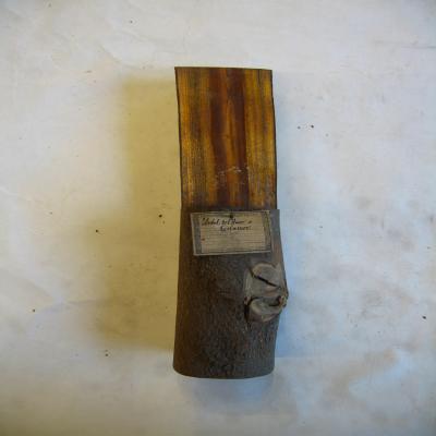 Dentro de una caja de cartón con muchas más maderas. La caja lleva una inscripción con rotulador rojo en la tapa: \MADERAS A4 C6\. El tronco lleva unida con un pequeño clavo a la corteza una pequeña etiqueta, antigua, con inscripción a máquina y bolígrafo: \UNIVERSIDAD CENTRAL. \Árbol del Amor ó Ciclamor\. Gabinete de Historia Nat.\. En el extremo completo tiene escrito con rotulador \CICLAMOR o árbol del amor\.
