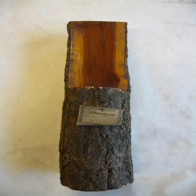 Angiospermas. Clase Magnoliopsida (Dicotiledóneas). Fam. Roseaceae Fragmento de tronco de albaricoquero. Pesado. Hacia la mitad de la pieza, se ha cortado longitudinalmente y transversalmente, de modo que la mitad del tronco está completa, y la otra sólo conserva la mitad longitudinal. Este corte permite ver el interior de la madera. Corteza algo gruesa, muy rugosa, escamosa, con muchas grietas y marcas. Color parduzco. Interior con el centro más oscuro, y líneas longitudinales más oscuras. Además de los anillos de crecimiento se observan finas estrías radiales. Está barnizado el interior y uno de los extremos (el cortado).
