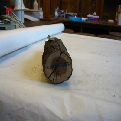 Dentro de una caja de cartón con muchas más maderas. La caja lleva una inscripción con rotulador rojo en la tapa: \MADERAS A4 C6\. El tronco lleva unida con un pequeño clavo a la corteza una pequeña etiqueta, antigua, con inscripción a máquina y bolígrafo: \UNIVERSIDAD CENTRAL. Albaricoquero. Gabinete de Historia Nat.\. En el extremo completo tiene escrito dos veces con rotulador \Albaricoquero\.