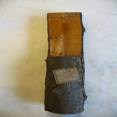 El tronco lleva unida con un pequeño clavo a la corteza una pequeña etiqueta, antigua, con inscripción a máquina y bolígrafo: \UNIVERSIDAD CENTRAL. Ciruelo. Gabinete de Historia Nat.\. En el extremo completo tiene escrito dos veces con rotulador \CIRUELO\.