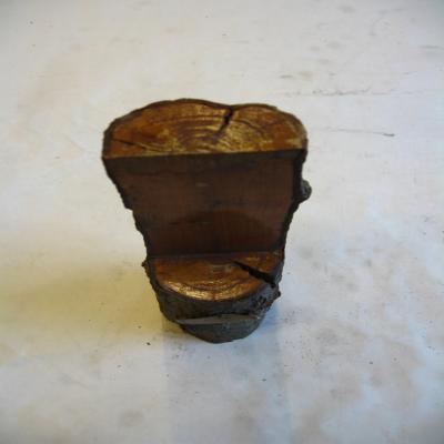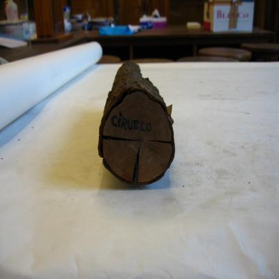 Fragmento de tronco de ciruelo. Pesado. Hacia la mitad de la pieza, se ha cortado longitudinalmente y transversalmente, de modo que la mitad del tronco está completa, y la otra sólo conserva la mitad longitudinal. Este corte permite ver el interior de la madera.