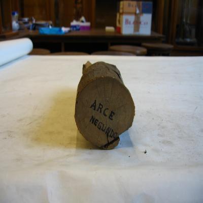 El tronco lleva unida con un pequeño clavo a la corteza una pequeña etiqueta, antigua, con inscripción a máquina y bolígrafo: \UNIVERSIDAD CENTRAL. \Arce ó Acer Negundo\. Gabinete de Historia Nat.\. En el extremo completo tiene escrito dos veces con rotulador \ARCE NEGUNDO\.