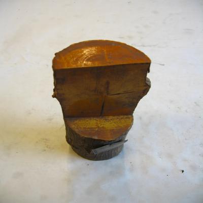 Fragmento de tronco de arce negundo. Pesado. Hacia la mitad de la pieza, se ha cortado longitudinalmente y transversalmente, de modo que la mitad del tronco está completa, y la otra sólo conserva la mitad longitudinal. Este corte permite ver el interior de la madera.