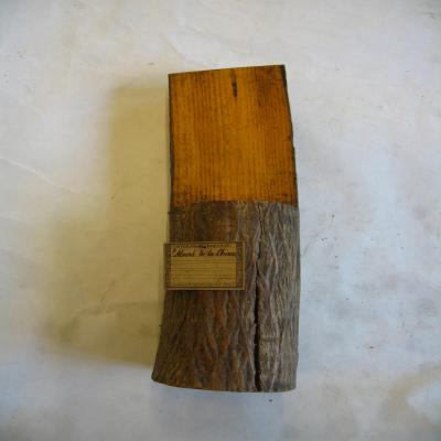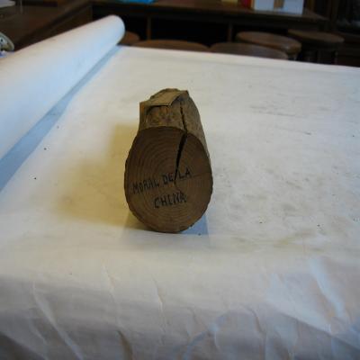 Fragmento de tronco de moral de la China. Pesado. Hacia la mitad de la pieza, se ha cortado longitudinalmente y transversalmente, de modo que la mitad del tronco está completa, y la otra sólo conserva la mitad longitudinal. Este corte permite ver el interior de la madera.