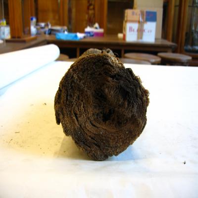 Fragmento de tronco de árbol, tipo palmera. Cilíndrico, no muy delgado, ligero. Lo que más destaca es su estructura fibrosa, lo que hace que la madera sea tan ligera. El centro es algo hueco. La corteza es rugosa, con una especie de costillas longitudinales. Tiene un lateral con la corteza descamada, como en tiras. Color parduzco. Interior fibroso, con más hueco en el centro.