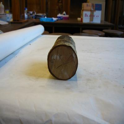 Interior macizo, bastante uniforme. Apenas se aprecian los anillos de crecimiento. Color pardo claro.