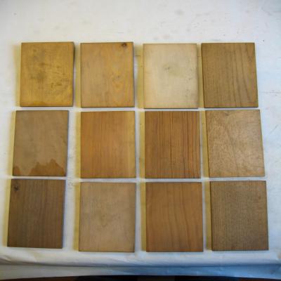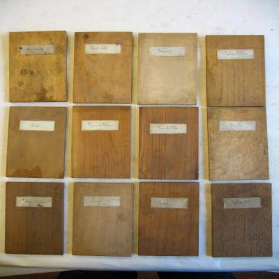 Colección de 12 tablas de madera, trabajadas, de forma rectangular. Cada una está identificada. Hay maderas de los siguientes árboles: