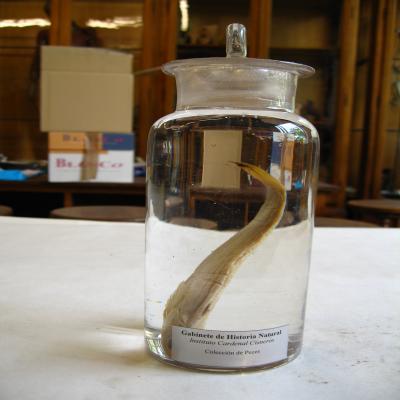 En un bote de cristal, conservados en líquido (alcohol). Con dos etiquetas: -Una interior blanca, pequeña, con inscripción a ordenador: "Última renovación alcohol 70º, junio 2005". -Etiqueta interior blanca a ordenador (de las que se hicieron para el 150 aniv. En 1995), con inscripción: "Gabinete de Historia Natural. Instituto Cardenal Cisneros. Colección de Peces".