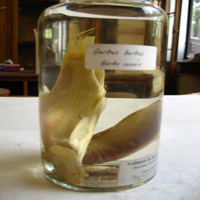 -Etiqueta interior blanca a ordenador (de las que se hicieron para el 150 aniv. En 1995), con inscripción: "Gabinete de Historia Natural. Instituto Cardenal Cisneros. Colección de Peces", y con bolígrafo "Barbus barbus (L.) (Barbo común)".