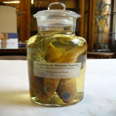 -Etiqueta interior blanca a ordenador (de las que se hicieron para el 150 aniv. En 1995), con inscripción: "Gabinete de Historia Natural. Instituto Cardenal Cisneros. Colección de Peces" y con bolígrafo "Sr. Arévalo".