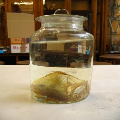 En un bote de cristal, conservados en líquido (alcohol). Con dos etiquetas: