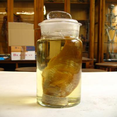 En un bote de cristal, conservados en líquido (alcohol). Con dos etiquetas: