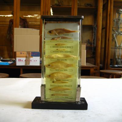 Expositor de cristal rectangular, apoyado sobre una base de madera y sujeto por soportes metálicos. En el interior hay un panel de plástico blanco sobre el que se situan los peces en fila vertical. Cada ejemplar tiene abajo una etiqueta con el nombre de la especie escrito a ordenador, menos Leuciscus agassizzi que está a bolígrafo.