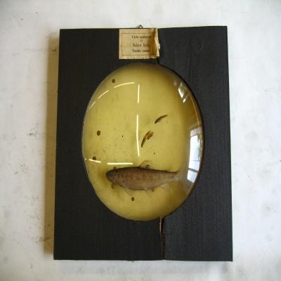 Etiqueta en la parte delantera con inscripción a máquina: "Ciclo evolutivo del Salmo fario (Trucha común)".