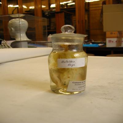 -Etiqueta interior blanca a ordenador (de las que se hicieron para el 150 aniv. En 1995), con inscripción: "Gabinete de Historia Natural. Instituto Cardenal Cisneros. Colección de Peces" y a bolígrafo "BETOIDEO: Raya".