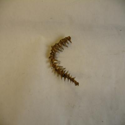 Mandíbula de tiburón incompleta, en la que se pueden observar varias filas de dientes afilados. Los dientes tienen el borde serrado.