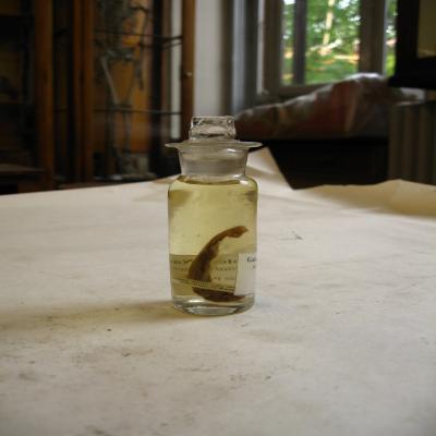 En un bote de cristal, conservados en líquido (alcohol). Con dos etiquetas: