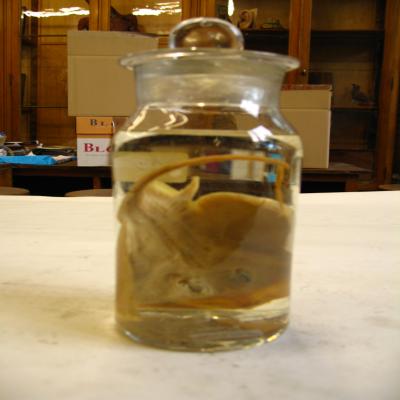 En un bote de cristal, conservados en líquido (alcohol). Con tres etiquetas: