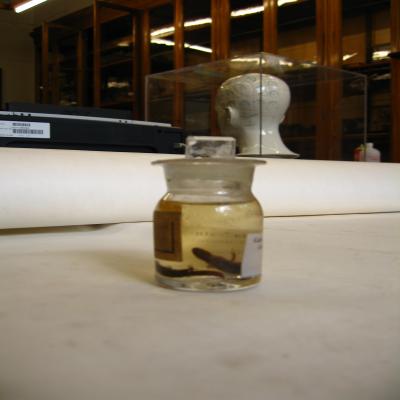 Podría corresponde a la pequeña colección de reptiles y algunos otros animales conservados en espíritu de vino, remitido de Fernando Póo y regalado por el Sr. D. José Muñoz y Gaviria, Vizconde de San Javier en el curso (1861-62).