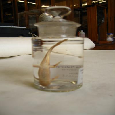 Podría corresponde a la pequeña colección de reptiles y algunos otros animales conservados en espíritu de vino, remitido de Fernando Póo y regalado por el Sr. D. José Muñoz y Gaviria, Vizconde de San Javier en el curso (1861-62).