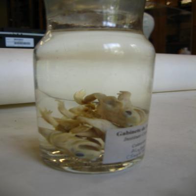 Podría corresponde a la pequeña colección de reptiles y algunos otros animales conservados en espíritu de vino, remitido de Fernando Póo y regalado por el Sr. D. José Muñoz y Gaviria, Vizconde de San Javier en el curso (1861-62).