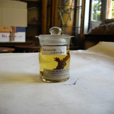 -Etiqueta interior blanca a ordenador (de las que se hicieron para el 150 aniv. En 1995), con inscripción: "Gabinete de Historia Natural. Instituto Cardenal Cisneros. Colección de Reptiles", y a bolígrafo "Salamandra salamandra (Salamandra)".