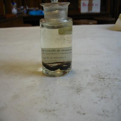 Podría corresponde a la pequeña colección de reptiles y algunos otros animales conservados en espíritu de vino, remitido de Fernando Póo y regalado por el Sr. D. José Muñoz y Gaviria, Vizconde de San Javier en el curso (1861-62).