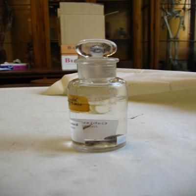 En un bote de cristal, conservados en líquido (alcohol). Con cuatro etiquetas: