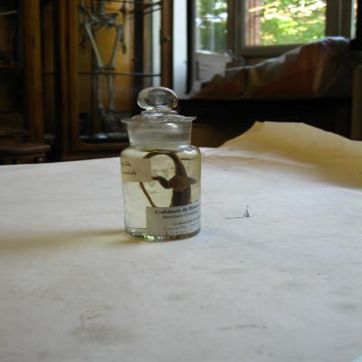 En un bote de cristal, conservados en líquido (alcohol). Con cuatro etiquetas: