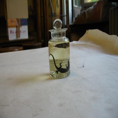 Podría corresponde a la pequeña colección de reptiles y algunos otros animales conservados en espíritu de vino, remitido de Fernando Póo y regalado por el Sr. D. José Muñoz y Gaviria, Vizconde de San Javier en el curso (1861-62).