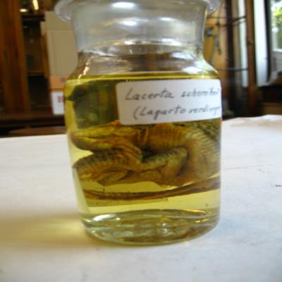 Podría corresponde a la pequeña colección de reptiles y algunos otros animales conservados en espíritu de vino, remitido de Fernando Póo y regalado por el Sr. D. José Muñoz y Gaviria, Vizconde de San Javier en el curso (1861-62).