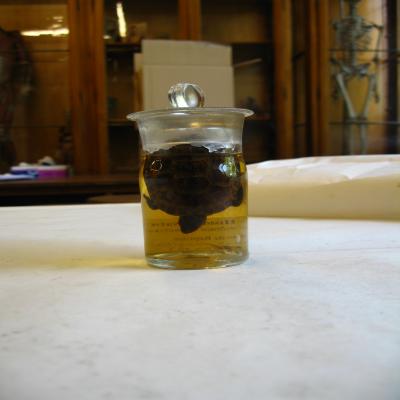 En un bote de cristal, conservados en líquido (alcohol). Con dos etiquetas: