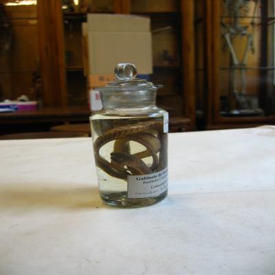 Podría corresponde a la pequeña colección de reptiles y algunos otros animales conservados en espíritu de vino (1861-62) o la colección de culebras (1862-63), ambas remitidas por Fernando Póo y regalado por el Sr. D. José Muñoz y Gaviria, Vizconde de San Javier.