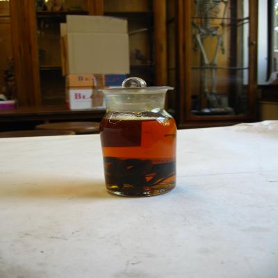 En un bote de cristal, conservados en líquido (alcohol). Con tres etiquetas: