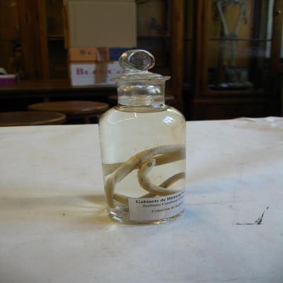 Podría corresponde a la pequeña colección de reptiles y algunos otros animales conservados en espíritu de vino (1861-62) o la colección de culebras (1862-63), ambas remitidas por Fernando Póo y regalado por el Sr. D. José Muñoz y Gaviria, Vizconde de San Javier.