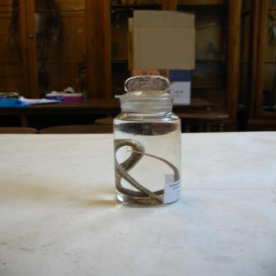 Podría corresponde a la pequeña colección de reptiles y algunos otros animales conservados en espíritu de vino (1861-62) o la colección de culebras (1862-63), ambas remitidas por Fernando Póo y regalado por el Sr. D. José Muñoz y Gaviria, Vizconde de San Javier.